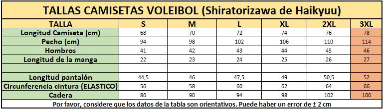 | Tallas Voleibol Academia Shiratorizawa | S-68, M-70, L-72, XL-74, 2XL-76, 3XL-78 |